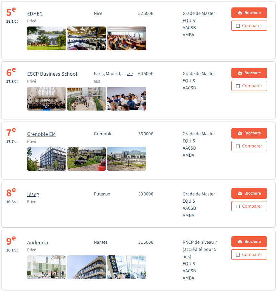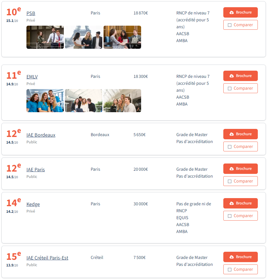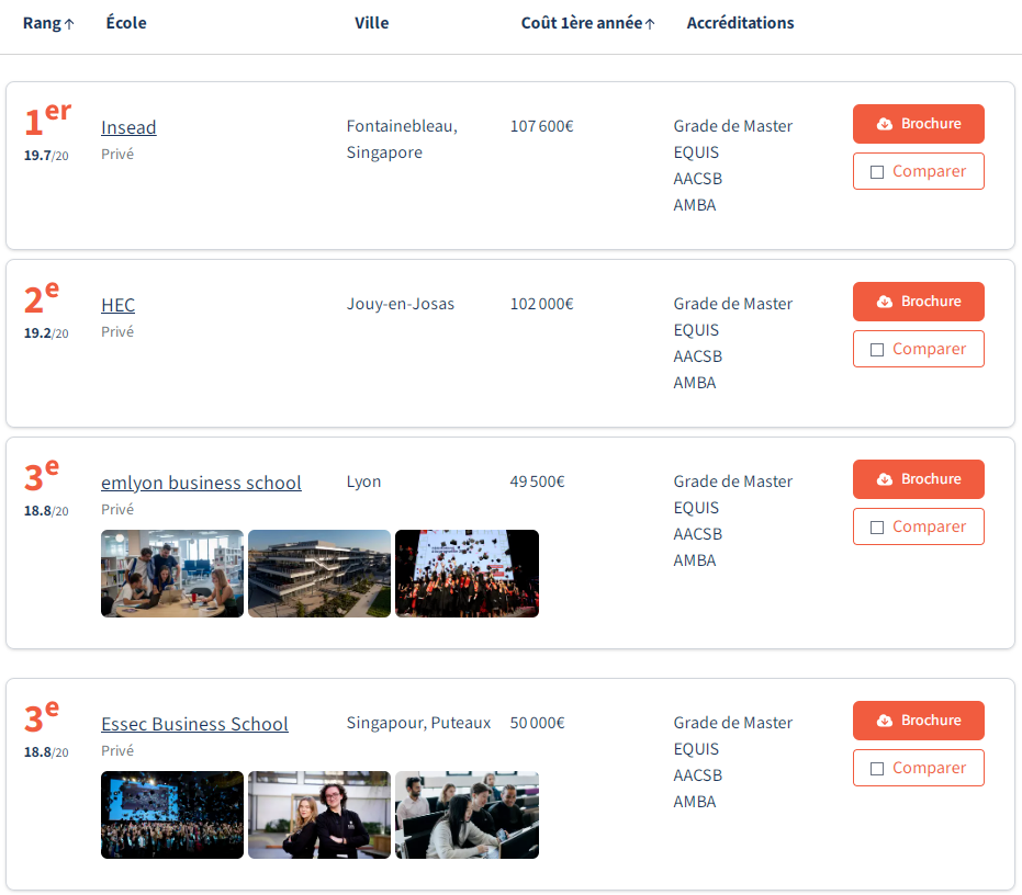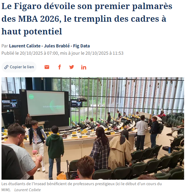 为何这份榜单独具权威性? 《费加罗学生报》的排名方法论以其严谨性与透明度而备受关注。其核心逻辑是:回归本质,聚焦资质。 在一个“MBA”头衔未被法律保护的市场上,权威认证是区分良莠最可靠的标尺。 本次排名首先基于四项标准筛选课程:课程须为通用型MBA、不接受纯在线或合作办学项目、课程介绍须明确标注MBA字样 排名基于两大核心维度: 学术认可度:包括国家认证(硕士等级认证、RNCP职业资质)、国际认证(AMBA、AACSB、EQUIS)以及入学要求的严格度。 国际与职业声誉:参考项目在全球权威排名(如《金融时报》、QS、LinkedIn)中的表现,以及毕业生薪酬水平。 值得一提的是,AMBA认证是针对MBA项目的专项认证,是衡量MBA质量的重要指标。而AACSB和EQUIS则是对整个商学院的认证,代表着商学院的综合实力。只有在学术质量、认证资质和国际声誉上都具备高标准的MBA项目,才能进入此次评选范围。 2026年榜单揭晓 在2026年法国MBA排行榜中: Insead欧洲工商管理学院以总分 19.7/20 高居榜首 Insead以近乎完美的成绩夺得榜首,尤其在"职业声誉"项获得满分,彰显其"CEO摇篮"的绝对实力。该校拥有多位诺贝尔经济学奖得主参与教学,校友网络遍布全球,多达十余位校友现任法国SBF 120及欧洲EuroStoxx 50企业的执行委员。 HEC Paris巴黎高等商学院紧随其后(19.2分) HEC凭借其强大的品牌声誉和完整的认证体系,稳居第二。在多项国际排名中,HEC同样表现优异,在2026年QS全球商科排名中,其管理学、金融学和市场营销学硕士项目均位列全球第一。 ESSEC埃塞克商学院 与 EM Lyon里昂商学院并列第三(18.8分) 两所学校均以卓越的国际化和创新课程设计见长。ESSEC位于巴黎及新加坡校区,emlyon则以其强大的创业精神闻名,职业声誉得分亮眼。