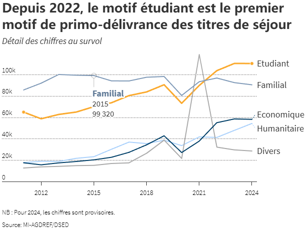 自2022年起,学生签证已成为非欧盟国家公民进入法国领土的首要理由。据内政部统计,2024年有超过11万名学生获此签证。这比以"家庭"为由获得居留许可的人数(9万人)多出2万人。经济类签证仅位列第三,2024年签发量为6万人次。