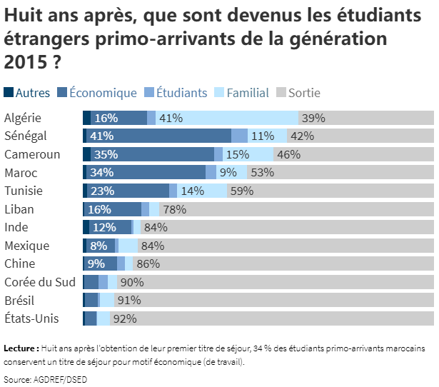 关于留在法国的原因,我们发现不同国家的学生表现各异。例如,在获得学生签证10年后,34%的摩洛哥学生因经济原因留下来,而因同样原因留下来的人数比例在阿尔及利亚学生中仅占11%。对后者而言,家庭因素是签证续签的首要原因,占签证续签总数的41%。