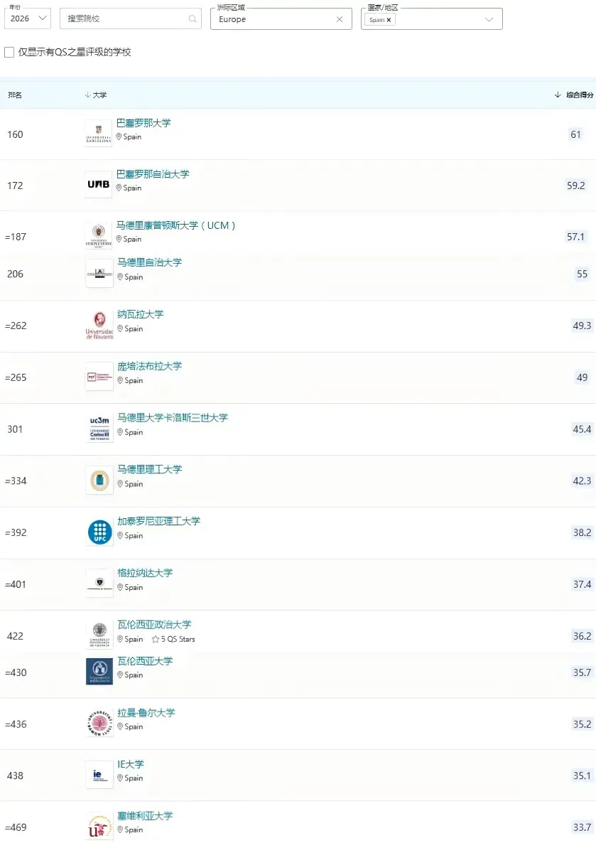 西班牙拥有多所 QS 排名靠前的百年名校,学历均受中国教育部认证。根据2026QS世界大学排名,西班牙多所大学进入世界500强。
