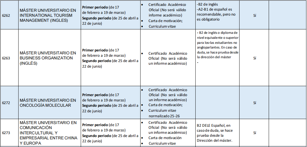 语言要求:西班牙语和所选专业语言(语言A和语言B)均需达到最低C1水平,可能会通过面试测试语言水平。