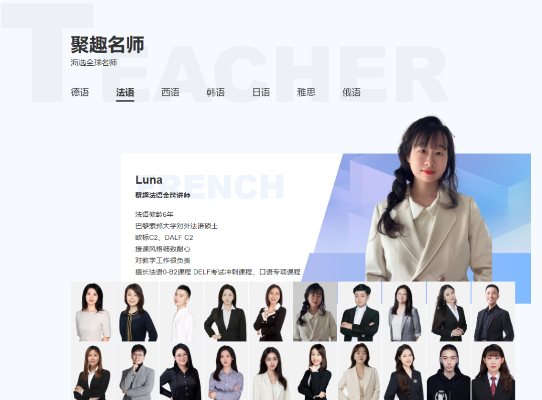 聚趣法语教研团队的全职教师均持有 C1 或同等及以上语言能力证书,95% 以上有留法经历且在法国生活多年,具备地道的法语发音和深厚的法国文化底蕴。采用 “双师制教学” 模式,一线教师负责课堂教学,资深语言专家和原知名机构培训师提供教学支持,实现因材施教。