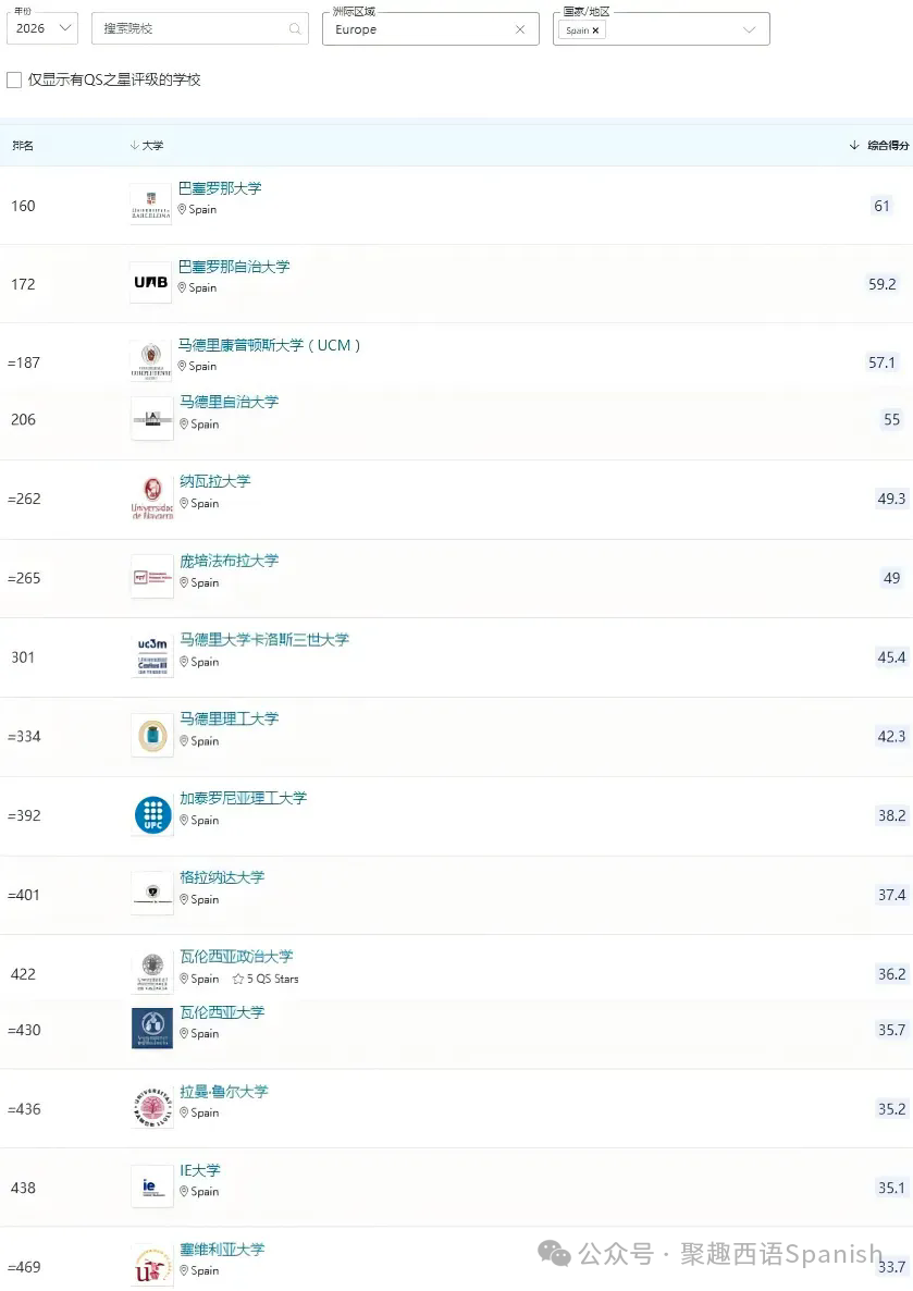 西班牙拥有多所 QS 排名靠前的百年名校,学历均受中国教育部认证。根据2026QS世界大学排名,西班牙多所大学进入世界500强。