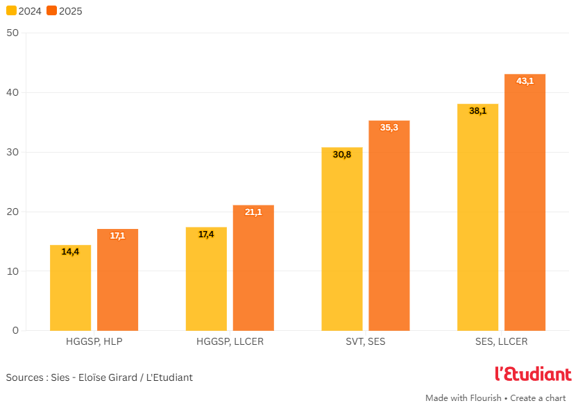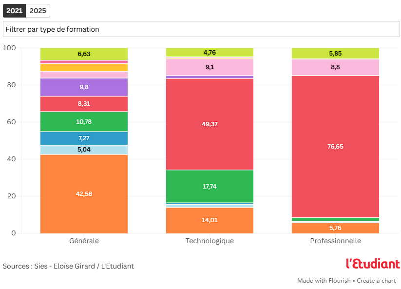 这种趋势首先体现在理科生群体中。2022年至2025年间,选择PASS的高中生比例将增长7.7个百分点(数学和物理化学专业学生)和7.8个百分点(物理化学和生物科学专业学生)。在非理科专业中也出现了类似现象:例如,选择生物与社会经济双修专业的学生,其申请IFSI的比例在同期增长了5.2个百分点。