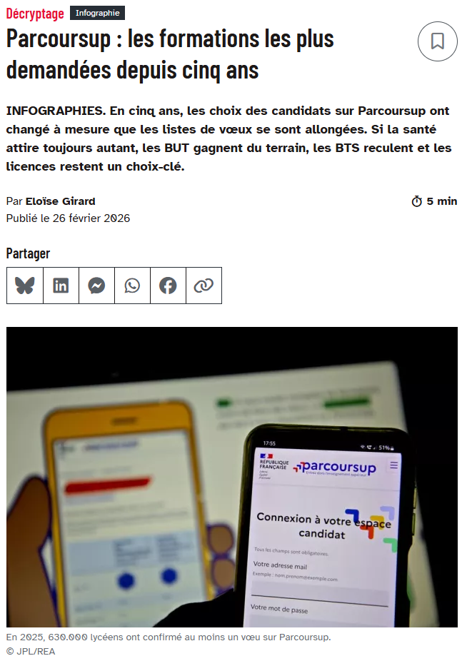 2025年,63万名高中生在Parcoursup平台上确认了至少一个志愿。由于志愿清单越来越长,申请总数持续增长:考生平均提交14.3个志愿,而2021年为12.8个。在过去的五年里,这种变化伴随着学生偏好的培训课程的变化。
