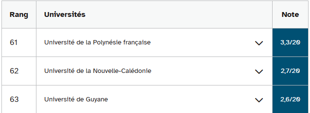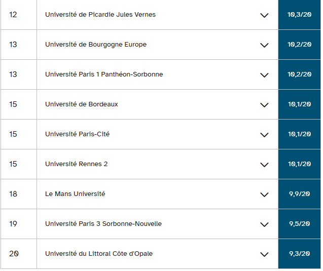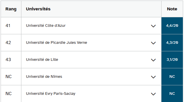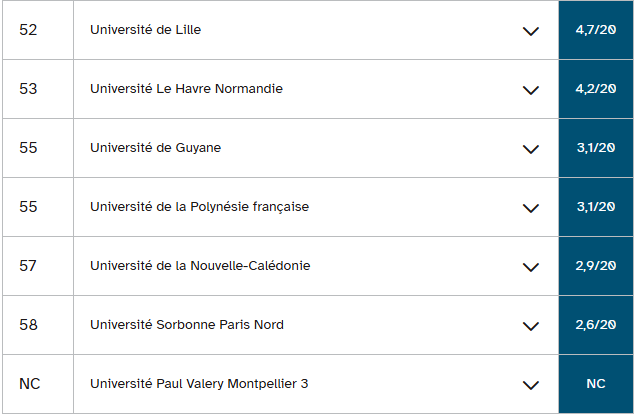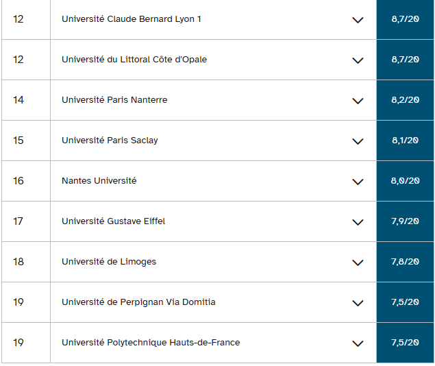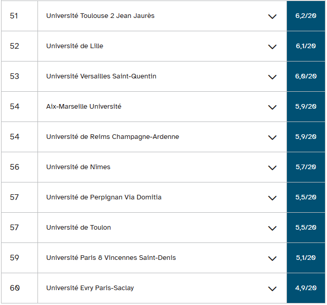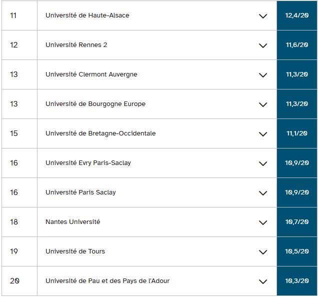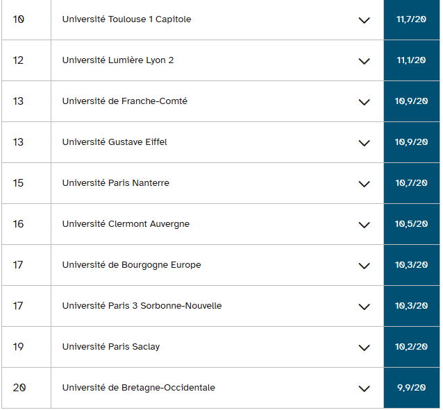 古斯塔夫·埃菲尔大学和南布列塔尼大学的情况也与此类似,它们在经济学和应用经济与管理学学士学位排名中分列二、三位。这两所大学在教育部预测的毕业率与三至四年实际毕业率之间分别存在12.3分和15分的差距。