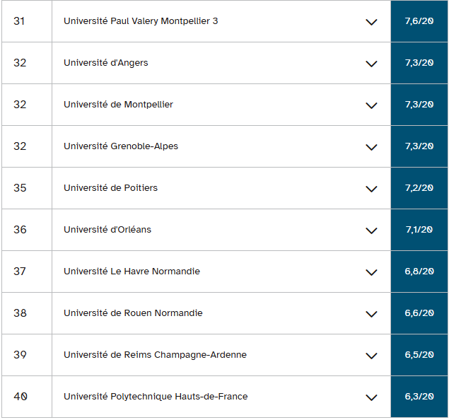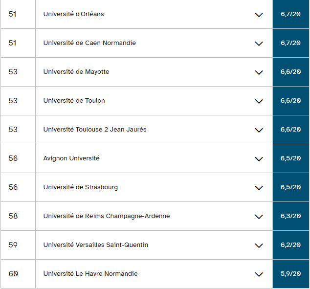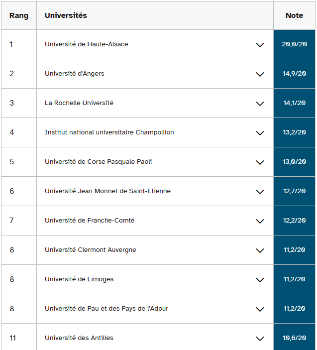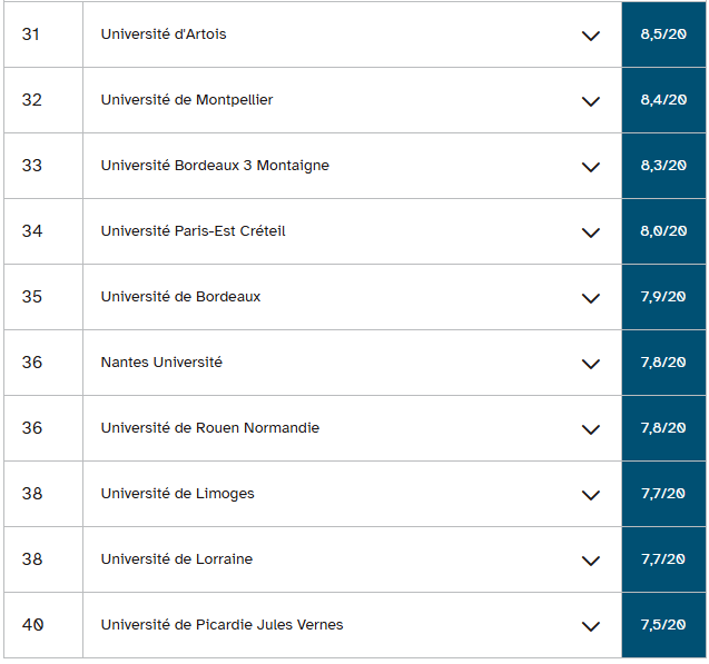 南布列塔尼大学在排名中也下滑一位,以三年47.3%的成功率和三至四年51.6%的成功率位居第三,而去年分别为44.8%和60.2%。