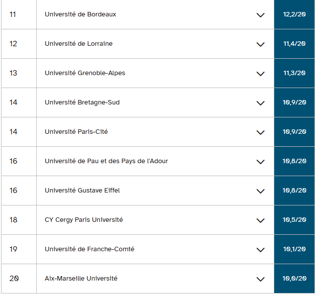 排名第三的USMB大学也比去年下降了一个名次,但仍然保持着很高的附加值(三年差距为22.5个百分点,三到四年差距为14.3个百分点)。巴黎萨克雷大学再次下降了一个名次,跌出前三名,排名第四。